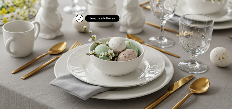 A escolha correta das louças e talheres pode transformar seu almoço de Páscoa. Se você não quer errar, é só apostar nas louças de porcelana branca, que são coringas e combinam com qualquer estilo de decoração. As louças estampadas e temáticas são um verdadeiro charme e trazem vida à mesa. Para complementar um toque mais sofisticado, utilize talheres dourados ou acobreados. Copos cristal e taças elegantes ou coloridas arrematam a montagem da mesa com delicadeza.