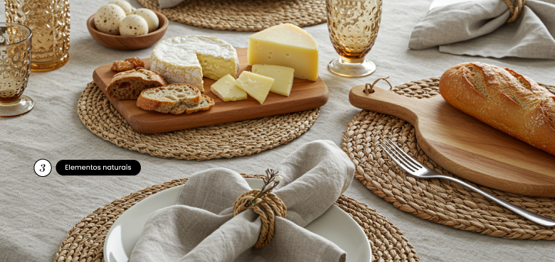 Além dos aparelhos de jantar, se o seu desejo é trazer aconchego à mesa, a mistura de texturas pode te ajudar! Guardanapos de linho, e jogos americanos de fibras naturais são detalhes que fazem toda a diferença. Para um ar mais rústico, invista em itens de madeira, como tábuas para servir pães e queijos. A combinação de materiais naturais com elementos mais refinados cria um equilíbrio ideal entre sofisticação e conforto.