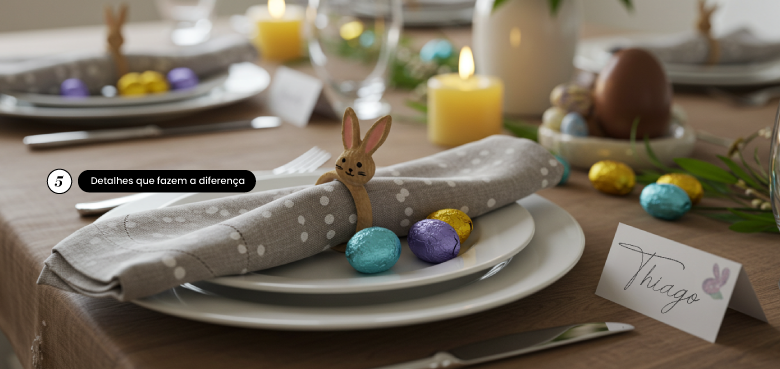 Os pequenos detalhes tornam esse momento ainda mais especial. Personalize a mesa com cartões de identificação para os convidados, deixando um recadinho carinhoso para cada um. Outra ideia encantadora é colocar um mini ovo de chocolate ou uma lembrancinha no prato de cada pessoa. Esses gestos simples criam um clima ainda mais acolhedor e memorável.