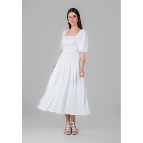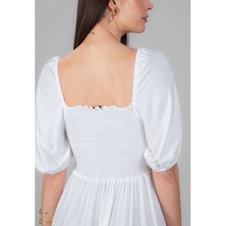 Vestido Longuete Traymon Com Lastex Manga Curta Bufante Branco
