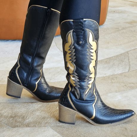Bota Nashiville Cano Alto Couro Anaconda Preto E Dourado