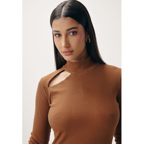 Vestido Canelado Justo Manga Longa Caramelo Dialogo Jeans