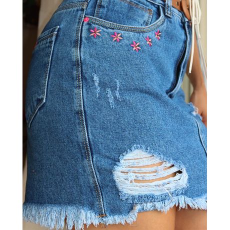 Mini Saia Jeans Consciência Cintura Alta Bordado Floral Barra Desfiada Azul Denim