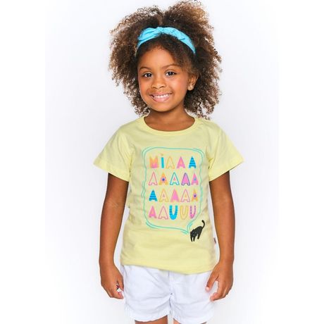 Blusa Miau Infantil Meia Malha Manga Curta Amarelo Claro