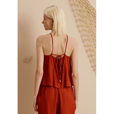 Detalhes Adicionais: Passador em formato de peixe no decote; alças finas e ajustáveis que cruzam nas costas; corte reto com caimento solto; cor terracota.
