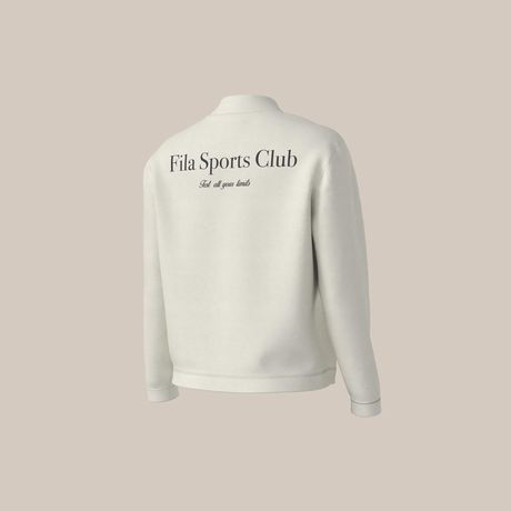 Detalhes Adicionais: Gola média com zíper frontal parcial, estampa "FILA Sports Club" na frente e costas, patch F-Box na manga, punhos ajustados