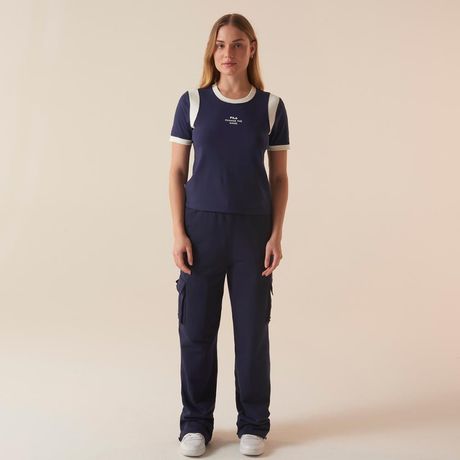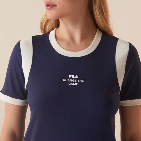Blusa FILA Ribbed Letter Retro Feminina Manga Longa Azul Marinho