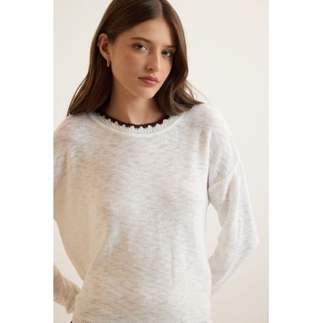 Blusa Tricot Detalhe Crochê Manga Longa Bege Claro