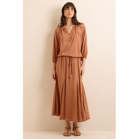 Saia confeccionada em viscose com caimento leve e toque macio, ideal para quem busca conforto sem abrir mão da elegância. O cadarço na cintura garante ajuste personalizado e praticidade, enquanto o comprimento longo e a estampa listrada bicolor valorizam a silhueta e acrescentam um ar contemporâneo ao look. Versátil, transita bem do dia a dia ao lazer e em ambientes de trabalho mais informais, combinando facilmente com blusas lisas, sandálias ou tênis. A composição predominantemente em viscose favorece respirabilidade e movimento fluido; com cuidados adequados, mantém aspecto e cores por mais tempo.