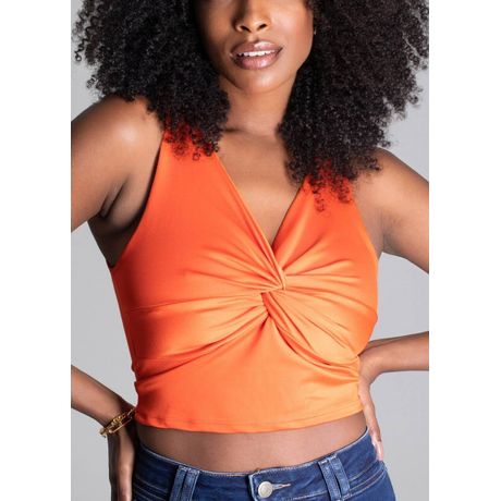 Detalhes Adicionais: Detalhe trançado na parte frontal, alças largas, decote em V nas costas, cor laranja intensa