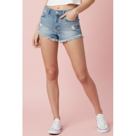 Short Feminino Com Bolsos E Lapela Ajustado Barra Desfiada Azul Claro Planet Girls